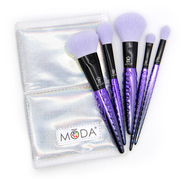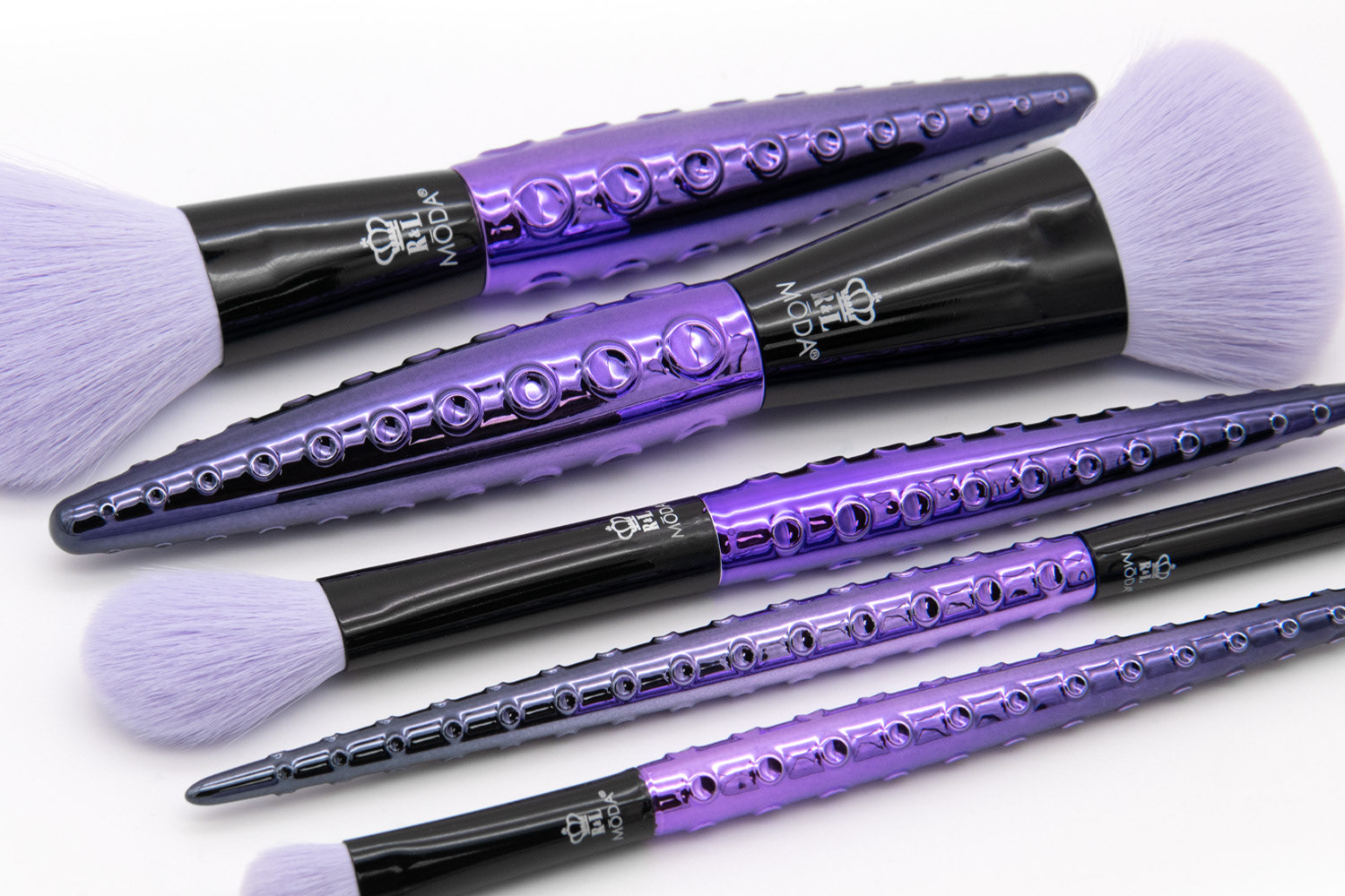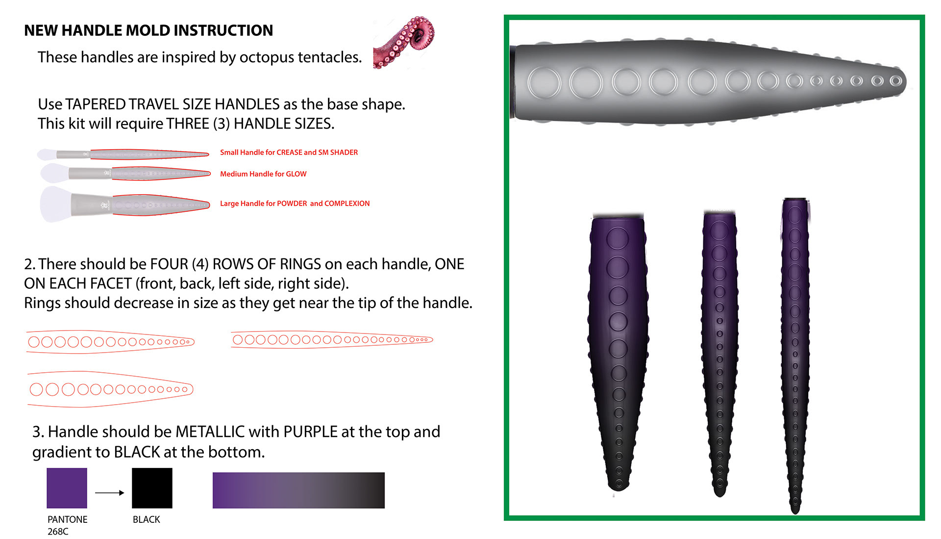 I was tasked with creating a companion kit for an updated "mermaid style" brush kit, inspired by characters from The Little Mermaid, and facilitate the instructions for manufacturing. My goal was to capture the colors and textures of the sea witch character, Ursula, so I guided the production team to create a unique mold for brush handles that resemble octopus tentacles. The handles feature vibrant purple handles that resemble the character, but are also the brand's signature color.